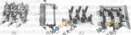 111.变配电站内安装有多种不同的高压电器,如断路器、负荷开关、隔离开关、高压熔断器、互感器等,以达到不同的控制和保护要求。下图所示的四种1OkV高压电器中,真空断路器是( )。