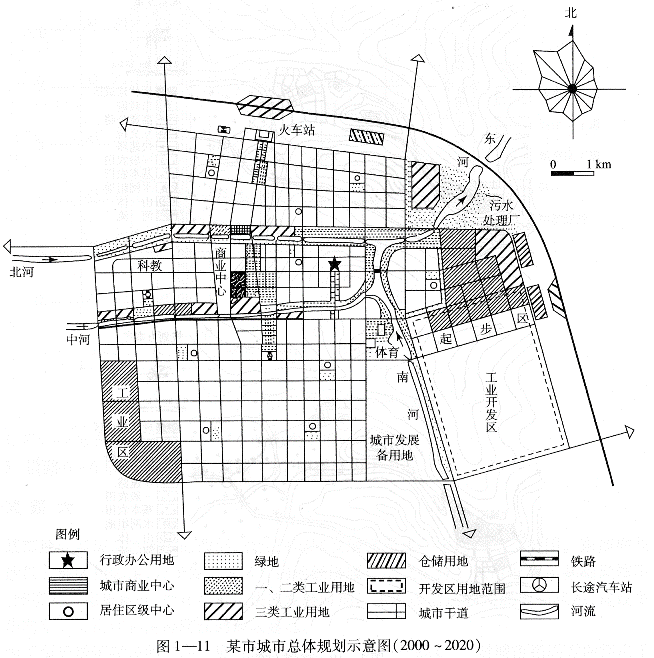 1.某平原地区城市,2000~2020年总体规划拟定为以轻型工业和商贸为主的地区中心城市。城市建设用地向南和向东发展。规划2020年城市人口50万人。城市建设用地为62km (包括工业开发区在内,不包括城市发展备用地;工业开发区原定用地范围为16km ,5年来已建成约1.5km ,另有约2.5km 已投入基础设施)。该总体规划方案(如示意图)经评审认为:城市性质、人口规模、城市建设用地发展方向、路网骨架基本合理。但对城市建设用地规模、城市商业中心和城市环境提出了重要修改意见。你认为上述三个方面存在的最主要问题是什么?并提出相应的主要调整措施。 ![]() |