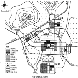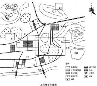 | 3.某地级市总体规划确定,主城区在现状基础上仍分为5个组团,该市地势西北高、东南低,有3条河流,主导风向东北风,主城区现状常住人口60万人,规划为90万人(见现状图和规划示意图)。 规划要点如下。 1.城市性质:省城北部区域中心城市,新型工业基地。 2.总体布局:为"二主三副"的组合型布局结构,"二主"为A、E组团,"三副"即B、C、D功能组团,各组团之间保留农田和生态绿地进行分隔。 3.道路交通:增建高速公路出入口 ,规划连接各组团的城市快速路系统。4.工业布局:规划4处工业区,在A组团安排机械制造和生物制药园区,C组团安排新型建材及水泥厂,E组团为电子信息高新技术园区,D组团安排物流中心。 5.在组团隔离带内留出高压电力线走廊,新规划1个水厂,4个污水处理厂。 试指出上述规划中不合理之处,并简要说明理由。 ![]() ![]() |