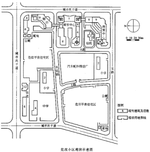 | 2.某城市小区,三面临城市干道,其南侧为支路。总用地为14.5公顷。现状市政管线已埋入道路地下,已建配电房能满足小区改建后要求。该区用地东侧已建成金融、商业服务中心;小区西北角有两幢新建住宅楼和一所中学;另有两所小学、一处幼托,以及两片危旧平房住宅区和一处汽车配件铸造厂。现已决定将此小区列为危改居住小区进行统一规划。 试根据现状条件(见示意图)及一般危改居住小区的规划设计要求,提出需要调整和增加的主要内容。 ![]() |