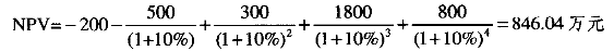| 4.某房地产投资项目总投资1000万元,第一年年初投入200万元,第一年、第二年年末分别投资500万元和300万元,第三年、第四年年末销售收入分别为1600万元和800万元,行业基准收益率为10%,则净现值为( )万元。 |