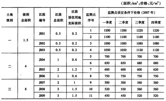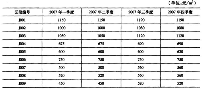 21.A市为地价动态监测试点城市,按技术规范的要求,该市居住用地监测范围覆盖全市所有的3个土地级别,每个土地级别各划分为3个地价区段,各级别土地面积、地价区段编号等具体信息见下表。![]() 请根据上表所给出的信息完成以下监测指标计算(计算保留整数)。 1.计算A市2007年各季度各区段居住地价水平值(列出J001的计算过程,并将全部结果在答题卡上制作成表格): (表格式样) 一季度 二季度 三季度 四季度 J001 …… J009 2.计算A市2007年第一季度各级别地价水平值。 3.计算A市2007年第一季度整体居住地价水平值。 4.以2007年第一季度为基期,并设定基期指数为100,计算一级地当年各季度定基地价指数。 |