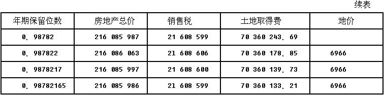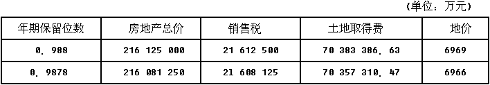 | 正确答案: 1.解题思路 根据所给资料,首先采用收益还原法评估不动产总价,然后采用剩余法评估该宗地于评估期日的价格。 2.计算步骤 (1)计算房地产总价 1)该建筑物房地产年总收益为30000000元。 2)求取该建筑房地产总费用: 管理费、维修费、税金为8000000元。 保险费=建安造价×0.2%=62500000×0.2%=125000(元) 总费用=管理费+维修费+保险费+税金 =8000000+125000 =8125000(元) 3)房地产总纯收益=30000000-8125000 =21875000(元) 4)房地产总价格= ![]() = ![]() =216085986.8(元) (2)计算土地价格 1)总建筑成本=建筑总面积×建安造价=62500000(元)。 2)估算房地产开发利息: 房地产开发利息=土地取得费用×[(1+10%) -1]+60%×6250×[(1+10%) -1]+40%×6250×[(1+10%) -1]=0.21×土地取得费用+6983586.19(元) 3)估算房地产开发利润: 投资回报率=(土地取得费用+开发成本)×30% =(土地取得费用+62500000)×30% =0.3×土地取得费用+18750000(元) 4)估算房地产销售税费: 销售税费=售价×10%=216085986.8×10%=21608598.68(元) 5)估算待估宗地价格: 土地取得费用=房地产总价-开发成本-利息-利润-税费 =216085986.8-62500000-(0.21×土地取得费用+6983586.19)-(0.3×土地取得费用+18750000)-21608598.68 =106243801.90-0.51×土地取得费用 则:土地取得费用=106243801.90-0.51×土地取得费用 土地取得费用=70360243.69(元) 地价=土地取得费用/(1+购地税费) =70360243.69/(1+1%) =6966(万元) 附:年期不同保留位数时的不同结果对照表 ![]() ![]() |