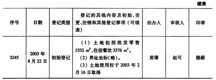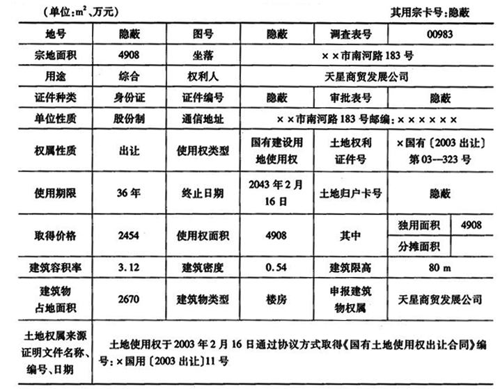 1.2007年2月16日,受天星商贸发展公司委托,某评估公司对其拥有的部分不动产进行估价并进行资产核算。据委托方初步说明,估价对象土地于2003年2月16日通过出让方式取得,当时总面积为4908m2,2004年3月20日将批发零售部分转让出去,住宿餐饮部分2004年3月26日抵押给民生银行,抵押期限1年,后因还款纠纷于2005年6月6日被法院查封,2005年11月20日解除查封。另外,由于对土地面积存在疑义,委托方曾要求登记机关进行了重新认证和登记。为了查证土地的权属状况,土地登记机关给估价师展示了该土地的相关资料。下面是其中一份主要土地登记卡的抄写件,阅读后回答有关问题。![]() ![]() 问题(每小题5分): 1.由于估价师笔误,这份抄写件的关于填写的内容,出现了至少4处错误,请指出并将更正内容列在下面。 2.上述表格只是土地初始登记卡,一般情况下,如果土地权属发生变化,均会增加相应的登记卡,以记载相关情况。请根据委托方说明中的信息,判断该土地登记档案中可能还有其他哪些登记卡? 3.估价师调查中没有查到转让批发零售部分的收益,但是根据有关资料判断,估价对象所在区域商服地价水平在2003年2月16日至2004年3月20日之前没有变化,根据上述相关信息,测算2004年土地转让收益,并列出估算式(土地面积以建筑面积进行分摊,不考虑土地历史用途价值差异)。 4.估价师调查得知,估价对象所在区域商服基准地价为每建筑平方米3000元(基准日为2007年1月1日),其中,商业零售和住宿餐饮的修正系数分别为+7%和-4%。根据上述相关信息,判断该公司土地2008年7月1日价值,并列出估算式(不考虑区位、个别因素差异及时间因素)。 |