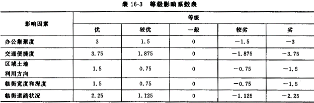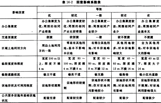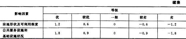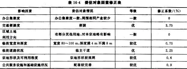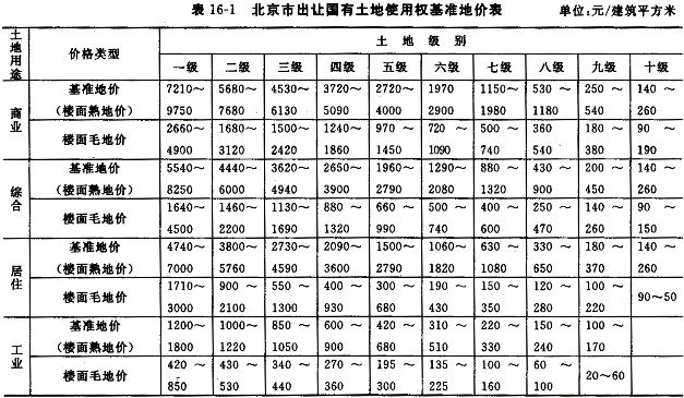17.北京市人民政府于2002年12月4日发布了《北京市人民政府关于调整本市出让国有土地使用权基准地价的通知)(京政发[2002]32号),对1993年北京市出让国有土地使用权基准地价(《北京市人民政府发布北京市出让国有土地使用权基准地价的通知》[京政发(1993)34号])进行了调整更新,从2002年12月10日起施行新的出让国有土地使用权基准地价(见表16-1)。![]() 调整后的基准地价是指各土地级别内,土地开发程度为宗地外通路、通电、通信、通上水、通下水、通燃气、通热力及宗地内土地平整(简称"七通一平"),或宗地外通路、通电、通信、通上水、通下水及宗地内土地平整(简称"五通一平"),在平均容积率条件下,同一用途的完整土地使用权的平均价格。其中:基准地价的基准期日为2002年1月1日;土地用途划分为商业、综合、居住、工业等四类;商业、综合、居住用地1~6级的开发程度为"七通一平",7~10级的开发程度为"五通一平";工业用地1~5级的开发程度为"七通一平",6~9级的开发程度为"五通一平";商业、综合、居住用地1~6级的平均容积率为2,7~10级的平均容积率为1;工业用地的平均容积率为1。 基准地价的表示形式为楼面熟地价,同时公布楼面毛地价。楼面熟地价是指各土地级别内,完成通平的土地在平均容积率条件下,每建筑面积分摊的完整土地使用权的平均价格。楼面毛地价是指各土地级别内,在平均容积率条件下,政府收取的某种用途法定最高出让年期内的土地出让金、市政基础设施配套建设费的平均楼面价格。 根据上述基准地价,通过对估价期日、年期、容积率及各种因素的修正测算待估宗地的土地价格。 |