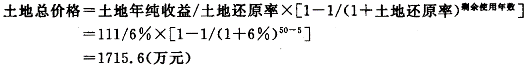 正确答案:11.AB;12.ABD;13.D;14.A;15.D 解题思路:4.计算土地总价格。该宗土地是1995年11月1日经过出让获得50年使用权的,至2000年11月1日已经过了5年,剩余使用年限为35年。土地总价格=土地年纯收益/土地还原率×[1-1/(1+土地还原率)剩余使用年数]=111/6%×[1-1/(1+6%)40-5]=1609.3(万元)土地单位面积价格=土地总价格/土地面积=1609.3×1000011000=16093(元/㎡)55.(一)解题思路(1)根据办公楼出租资料求取房地合一的房地产共同产生的纯收益。(2)计算建筑物部分产生的纯收益。(3)从房地合一的房地产共同产生的纯收益中扣除建筑物的纯收益,分离出土地纯收益。(4)计算剩余使用年限下的土地收益价格。(二)公式与计算步骤1.本题应用的主要计算公式房地年纯收益=房地年总收益-年总费用。建筑物年纯收益=建筑物现值×建筑物还原率土地年纯收益=房地年纯收益-建筑物年纯收益有限年期土地价格=土地年纯收益/土地还原率[1-1/(1+土地还原率)剩余使用年数]2.计算步骤(1)计算房地年纯收益、房地年总收益。该办公楼出租,除租金外还收取押金,因此年总收益中还应该包含押金的年运用收益。年租金收益=月租金收入×12月=30×12=360(万元)押金年运用收益=押金×押金收益率=60×5%=3(万元)年总收益=年租金收益+押金年运用收益=360+3=363(万元)计算房地年总费用:年总费用=月平均费用×12月=15×12=180(万元)计算房地年纯收益:房地年纯收益=房地年总收益-房地年总费用=363-180=183(万元)(2)计算建筑物年纯收益、建筑物现值。该办公楼建成于1995年11月1日,至2000年11月1日已经过了5年,残值率为O。建筑物现值=重置价格×建筑面积×剩余使用年数/耐用年限=4000×2500×(50-5)/50=900(万元)建筑物年纯收益=建筑物现值×建筑物还原率=900×8%=72(万元)(3)计算土地年纯收益。土地年纯收益=房地年纯收益-建筑物年纯收益=183-72-111(万元)(4)计算土地总价格。该宗土地是1995年11月1日经过出让获得50年使用权的,至2000年11月1日已经过了5年,剩余使用年限为45年。 (5)计算土地单位面积价格。土地单位面积价格=土地总价格/土地面积=1715.6×10000/1000=17156(元/㎡) |