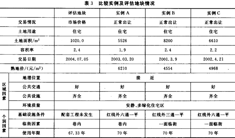 | 3.土地估价技术报告 第一部分 总述 一、估价项目名称 ××房地产发展有限公司涉及法律诉讼的土地价格评估 二、委托估价方 ××市中级人民法院 三、受托估价方(略) 四、估价目的 根据××房地产发展有限公司提供的《国有土地使用证》,权利人为××房地产发展有限公司,已设定抵押权,抵押权人为××银行,因未能按期还款,估价对象土地已由××市中级人民法院查封。现受委托评估土地的市场价格,供委托方确定拍卖价格提供参考;同时也为市国土资源局在办理土地变更登记手续时,了解该土地交易价格是否合理提供决策依据。 五、估价依据 1.《中华人民共和国土地管理法》及实施条例。 2.《中华人民共和国城市房地产管理法》。 3.《中华人民共和国城镇国有土地使用权出让和转让暂行条例》。 4.《城镇土地估价规程》。 5.《城镇土地分等定级规程》。 6.委托方及案件当事人提供的有关资料。 7.委托评估函。 8.《国有土地使用证》[××字(1998)第×××××号]。 9.《国有土地使用权出让合同》[××土地出让合同字第×××号]。 10.《关于××商品住宅项目可行性研究报告的批复》[××计投××号]。 11.《建设用地规划许可证》[××规地×第×××号]。 12.其他有关资料。 13.估价人员实地勘察、调查资料。 六、估价基准日 2004年7月5日 七、估价日期 2004年7月5日至7月14日 八、地价定义 本报告提供的土地价格是2004年7月5日住宅用地使用权市场价格。 九、估价结果 经评估,待估宗地于估价基准日在现状条件下67年4个月使用期限的土地使用权价格如下。 土地单价:4562元/㎡。总价:10237128元。 大写:壹仟零贰拾叁万柒仟壹佰贰拾捌元整(人民币元) 十、需要特殊说明的事项 1.本估价报告提供的评估结果是在全部限制条件下于估价期日的公开市场价值,所谓公开市场价值指评估对象于估价基准日,在市场上出售并按以下条件可取得的合理价格: (1)买卖双方不因任何特殊利益抬高或降低土地真实价值; (2)有一段合理交易时间; (3)在此期间土地市场应保持稳定; (4)房地产买卖程序应符合国家法律规定。 2.由于待估宗地的土地权属性质为国有划拨,考虑到未来转让土地的需要,本评估价格中包括土地使用权出让金;根据国家规定,该划拨土地转让时,应交纳土地出让金。 3.本报告的评估价格系全部限制条件下求得的。根据××房地产发展有限公司提供的《国有土地使用证》,该土地已设定抵押权,因抵押人未能按期还款,该土地已由××市中级人民法院查封。考虑到本次评估是为法院处置该土地提供价格依据,所以未考虑抵押权对价格的影响。 4.本报告自估价基准日起一年内有效。 十一、土地估价师签字 姓名 土地估价师资格证书号 签字 王** **** (签字) 李** **** (签字) 十二、土地估价机构(章) 二00四年七月十四日 第二部分 估价对象描述及地价影响因素分析 一、估价对象描述 1.土地登记状况。 根据××房地产发展有限公司提供的<国有土地使用证》,该土地所有权属于国家所有,土地使用权人为××房地产发展有限公司,土地权属性质为国有出让。该宗地已设定抵押权,抵押权人为××银行,因未能按期还款,估价对象土地已由××市中级人民法院查封。 估价对象土地为国有出让土地使用权,土地使用期限为2001年11月19日至2072年11月18日,自评估基准日起还剩余67年4个月。 2.土地权利状况。 根据××房地产发展有限公司提供的国有土地使用权证,估价对象宗地编号为××××,图号为××××,地号为××××,规划用途为住宅用地,土地总面积为1020.0㎡,处于基准地价三级区域。国有土地使用证号:××××××号。 3.土地利用状况。 (1)规划指标:根据土地使用权出让合同,项目批准建造四层公寓式商品住宅二幢,总建筑面积2244㎡。 (2)地块目前尚未开发,除沿××路还有三户待拆迁房屋外,其余已于2002年9月拆平。 二、地价影响因素分析 1.一般因素。 (略) 2.区域因素。 估价对象地块周边公交线路多,交通方便,距市中心直线距离约4km,四周多为二层或多层住宅,幼托、小学、商店、邮局、银行等公共设施齐全,人均公共绿化面积大,为该城市低密度居住区。 3.个别因素。 评估地块基本规则,面积小,土地开发工程建设所需的水、电尚未接通。 第三部分 土地估价 一、估价原则 本项目评估遵循土地估价的合法原则、公平公正原则、估价时点原则、供求原则。 二、估价方法和估价过程 由于估价对象位于城市低密度居住区,房地产市场和土地市场比较发达,有较多的成交实例可以选择,根据《城镇土地估价规程》(以下简称《规程》)并结合估价对象的具体特点,选择市场比较法及成本逼近法进行评估。 (一)市场比较法 根据替代原则,将估价对象土地与较近时期内已经发生交易的类似土地实例,进行对照比较,并依据后者已知的价格,参照该土地的交易情况、期日、区域以及个别因素等的差别,修正得出估价对象在评估期日地价的一种方法。其计算公式为: 待估宗地价格=比较实例宗地价格×待估宗地情况指数/比较实例宗地情况指数×待估宗地估价期日地价指数/比较实例宗地交易期日地价指数×待估宗地区域因素条件指数/比较实例宗地区域因素条件指数×待估宗地个别因素条件指数/比较实例宗地个别因素条件指数 1.选择比较实例。 估价人员收集了多宗土地的成交实例,选择了本市同属基准地价三级地段的3