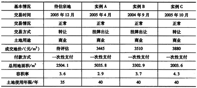 | 3.下面是一份土地估价技术报告的市场比较法测算说明部分(标注“略”的为正常内容)。请阅读后回答相关问题。 1.比较案例的选择 根据收集到的近几年商业用地交易案例资料,确定了与待估宗地类似的三宗土地作为比较对象,基本情况如下表所示。 ![]() 2.建立价格可比基础(略) 3.因素条件说明 整理估价人员收集的有关资料,将待估宗地与比较实例的因素条件列表表示,详见下表。 ![]() 4.编制比较因素条件指数表 根据待估宗地和比较案例在交易日期、交易方式、区域因素、个别因素的差别,确定各比较因素条件指数如下表所示。 ![]() 5.计算比准价格 将交易实例中的地价和待估宗地与比较实例的因素修正系数代人市场比计算公式,则: 比准地价A ![]() =3808.71(元/m )比准地价B ![]() =3950.33(元/m )比准地价C ![]() =4387.56(元/m )通过对上述三个比准价格分析比较,确定单位土地面积地价为4048.87元/m 。请根据上述内容回答以下问题。 1.在对所选案例的说明中,隐含了一个前提性条件,请问这一前提性条件是什么? 2.比较案例中,有挂牌出让案例,并且没有对挂牌方式进行价格修正,是否合理?为什么? 试比较一般情况下土地挂牌出让与土地转让交易在市场环境方面的不同。 3.在交易时间的修正中,案例B的修正系数为100,说明( )(只有1个选项)。 A.以案例B作为比较基准 B.案例B所在时点是地价指数基期 C.案例B所在时点与地价指数基期的市场地价水平一致 D.案例B与评估对象比较市场价格相差为零 4.该部分作为估价技术报告的内容,还有哪些错误和不完善的地方? |