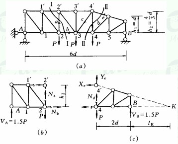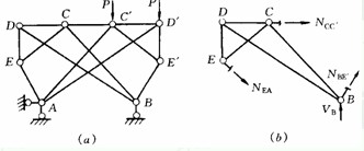 对于图2—15a所示的桁架,求出支座反力后,再根据其几何组成关系,可知EDCB与E'D'C'A两部分之间,由三根不相交于一点的链杆AE、BE'、CC'相连,故可通过该三杆作截面取图2—15b所示隔离体,由力矩平衡方程先求出NEA(或NBE'或NCC'),进而再求其他各杆轴力。