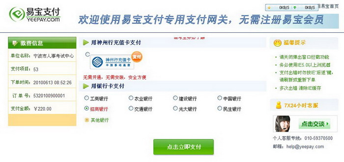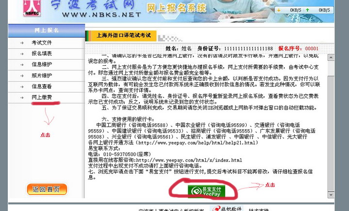1、看完网上支付说明后点击最下面的“易宝支付”按钮
