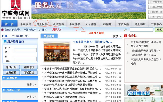 第一步:登陆考试系统,点击宁波考试网“网上报名”栏目