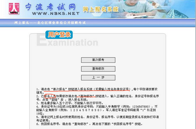 2、已报名人员请点击“查询修改”按钮进入,输入正确的姓名、身份证号和报名序号,点击“登陆”后 ,进入报名系统。