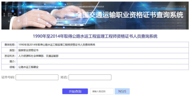 为配合做好全国首次交通运输工程监理工程师职业资格考试报名工作,日前,部职业资格中心上线了"1990年至2014年取得公路水运工程监理工程师资格证书人员查询系统”, 查询人员可通过全国交通运输工程监理工程师管理服务平台(jtgcjl.jtzyzg.org.cn)点击”我要查询” 选择“证书查询”- "1990年至2014年取得公路水运工程监理工程师资格证书人员查询系统”, 输入姓名和证件号码即可查询。