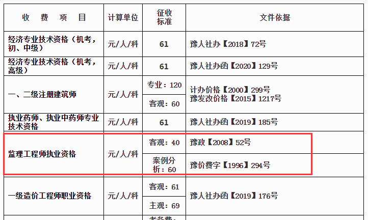 河南省人事考试中心公布:监理工程师收费标准
