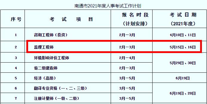 2月19日,南通市人事考试网发布2021年度人事考试工作计划,里面提及到2021年监理工程师考试报名时段是在2月-3月,考试日期为5月15日、16日。