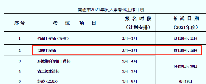 根据南通市发布的2021年度人事考试工作计划通知来看,预计监理工程师报名时段是2月-3月。
