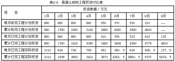 | 正确答案: 1.将各工作计划工程量与单价相乘后,除以该工作持续时间,得到各工作每月拟完工程计划投资额(0.5分);再将时标网络计划中各工作分别按月纵向汇总得到每月拟完工程计划投资额(0.5分);然后逐月累加得到各月累计拟完工程计划投资额。(0.5分) 2.工作H6~9月份每月完成工程量为5000÷4=1250(m /月)。(1)工作H6~9月份已完工程计划投资均为1250×1000=125(万元)。(2分) (2)工作H已完工程实际投资如下。 6月份:125×110%=137.5(万元)(1分) 7月份:125×120%=150.0(万元)(1分) 8月份:125×110%=137.5(万元)(1分) 9月份:125×110%=137.5(万元)(1分) 3.计算结果填入表8-6。 ![]() 【评分说明】 每月拟完工程计划投资:每答对一项给0.5分,最多4分。 累计拟完工程计划投资:共0.5分,有错项不得分。 每月已完工程计划投资:每答对一项给0.5分,最多2分。 累计已完工程计划投资:共0.5分,有错项不得分。 每月已完工程实际投资:每答对一项给0.5分,最多2分。 累计已完工程实际投资:共0.5分,有错项不得分。 4.投资偏差=已完工程实际投资-已完工程计划投资=5337-4775=562(万元),超支562万元;(算式1分,结果0.5分) 进度偏差=拟完工程计划投资-已完工程计划投资=4900-4775=125(万元),拖后125万元。(算式1分,结果0.5分) |
