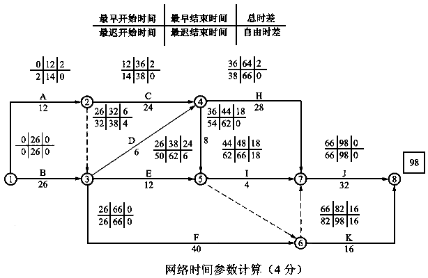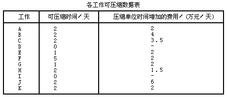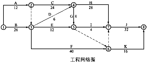 1.某施工单位编制的某工程网络图,如图所示,网络进度计划原始方案各工作的持续时间和估计费用见表。![]() ![]() 问题 1.在图中,计算网络进度计划原始方案各工作的时间参数,确定网络进度计划原始方案的关键路线和计算工期。 2.若施工合同规定:工程工期93天,工期每提前一天奖励施工单位3万元,每延期一天对施工单位罚款5万元。计算按网络进度计划原始方案实施时的综合费用。 3.若该网络进度计划各工作的可压缩时间及压缩单位时间增加的费用,见表。确定该网络进度计划的最低综合费用和相应的关键路线,并计算调整优化后的总工期(要求写出调整优化过程)。 ![]() |