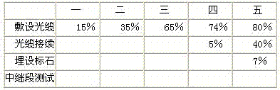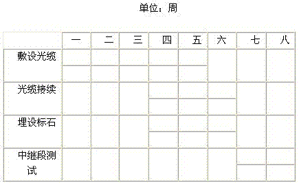 | 3.背景资料 某光缆线路工程进度计划见下表: ![]() 说明:①各项工作每周完成量相等。 ②光缆接续在敷设光缆完成60%工作量时开始。 ③埋设标石在敷设光缆完成60%工作量时开始。 ④中继段测试必须在光缆接续全部完成后才能开始。 ⑤每周工作七天。 第五周末时各项工作完成的进度累计情况如下: ![]() 问题 1.定性分析各工序前五周每周的实际进度与计划的关系。 2.计算第五周末各项工序实际避度比计划进度起前或拖后多少天?(计算结果如遇小数,采用进一法) 3.若从第六周开始仍按原计划周进度组织施工,总工期为多少天?比原计划延长多少天? 4.光缆中继段测试应包括哪些内容? |