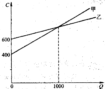 正确答案:AD 解题思路:设产量为Q,则引进甲、乙生产线的总成本分别为:C =400+0.6Q;C =600+0.4Q,在直角坐标系中画出两条总成本线,见下图:![]() 令C =C ,解出Q =1000万件从图中可以看出,当产量为低于1000万件时,甲生产线成本低;当产量为高于1000万件时,乙生产线成本低。因此正确答案为A、D。 |