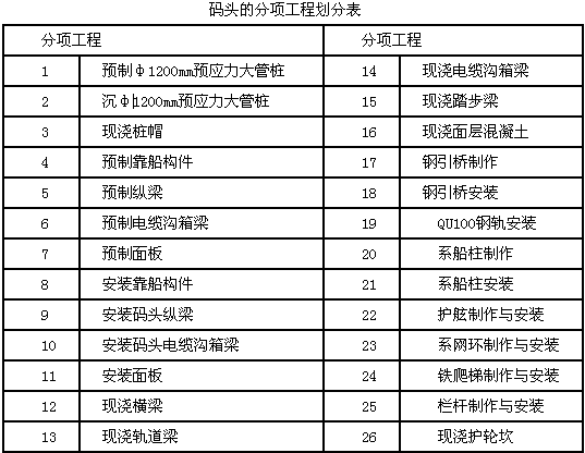 11.乍浦港二期多用途件杂货码头工程,位于浙江省平湖市乍浦镇西南杭州湾北岸。水工工程由栈桥及码头两部分组成。码头长336m,宽35m,设计为一个泊位。结构形式为高桩梁板式结构。桩基为φ1200预应力大管桩,现浇桩帽,现浇横梁,预制安装纵梁、面板,现浇混凝土方桩,现浇墩台、立柱、帽梁,安装预应力空心板,现浇面层。本工程码头的分项工程划分见下表所列。![]() 问题: (1)对本工程进行单位工程划分。 (2)对码头单位工程进行分部工程划分。 (3)指出码头单位工程各分部工程所包含的分项工程。 |