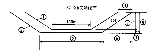 11.某航道局承担了3万t级航道疏浚工程,用一艘4500m 耙吸船施工。航道设计底标高-12.0m,天然床面标高-9.8m,设计底宽150m,底质为淤泥质土,边坡1:5,计算超深0.7m,计算超宽9m,疏浚工程量计算断面如图所示。设计疏浚工程量为3178157m (施工期回淤很少,不计),开工前,施工单位按浚前测量的水深图自行计算,并经监理确认的疏浚工程量为3200876m ,疏浚土全部抛到外海指定抛泥区,平均运距16.8km。耙吸船施工参数如下:平均航速8.6节,往返航行时间2.1h,调头卸泥时间0.35h,挖泥装船时间1.2h,装舱量2200m ,三班作业,时间利用率75%![]() 问题: (1)指出疏浚工程量计算断面示意图中①、②的含义和③~⑧项的数值。 (2)列出耙吸船在本工程中的施工工艺流程。 (3)本工程用于计量的疏浚土工程量应为多少?说明理由。该工程量由几部分组成? (4)计算该耙吸船可完成的日疏浚工程量,和完成工程的预期作业天数。(各题涉及计算的,要求列出算式及步骤) |
