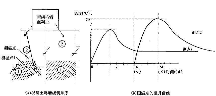 如下图中图(a)所示,坞墙与底板混凝土分两次浇筑,问歇期14d,测点1、测点2的温升曲线如图(b)所示。![]() 问题: |
