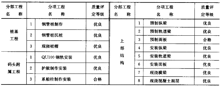 | 正确答案: (1)主要分部工程是:桩基工程、上部结构。 (2)主要分项工程是:桩基工程中的1、2;上部结构中的1、2、3、7。 (3)1)桩基工程:所含全部分项工程优良;所含主要分项工程全部优良,所以桩基工程应评为优良。2)码头附属工程:不参加评定。3)上部结构:因全部分项工程合格及优良,主要分项工程中有一项是合格,所以该分项工程只能评为合格。4)本单位工程质量等级不符合优良标准,因为主要分部工程中的上部结构评为合格。 |