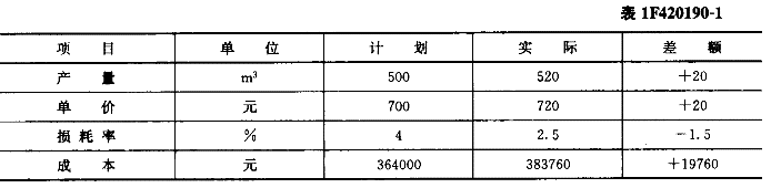 1.某混凝土工程,目标成本为364000元,实际成本为383760元。根据表1F420190-1相关资料进行项目成本分析。![]() 问题: (1)施工成本分析的方法有哪几种? (2)该工程施工项目成本差异是多少? (3)试用因素分析法分析该工程成本差异的原因。 |