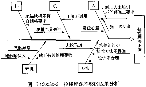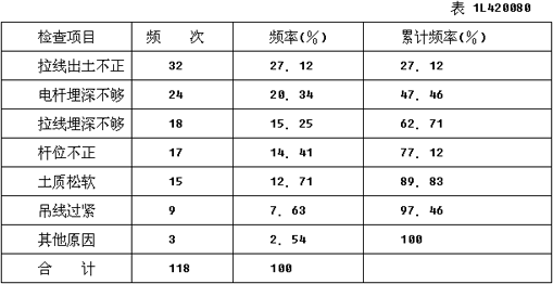 | 1.对某架空线路工程质量问题的调查,发现导致杆歪的原因有:电杆埋深不够24处,拉线出土不正32处,拉线埋深不够18处,土质松软15处,吊线过紧9处,杆位不正17处,其他原因3处。 问题 (1)编制杆歪质量问题调查表,画出杆歪质量问题的排列图,分析造成杆歪问题的主要原因是什么? (2)用因果分析法分析拉线埋深不够的原因。 (3)如何控制立杆的质量? (4)如何通过控制操作者的工作质量保证立杆的质量? |