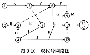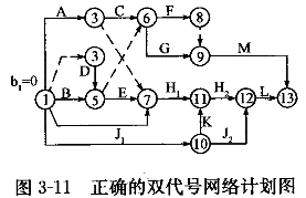 | 1.【背景材料】 某网络图有A~M共13项工作,其中的工作K是J的前一时段的紧后工作,K又是H后一时段的紧前工作。根据逻辑关系绘出双代号网络图,如图3-10所示。其中,节点编号①~⑦是正确的。 ![]() 【问题】 1.逐条列出并说明网络图中的错误。 2.绘出正确的网络图(工作项目不能少,逻辑关系不改变)。 |