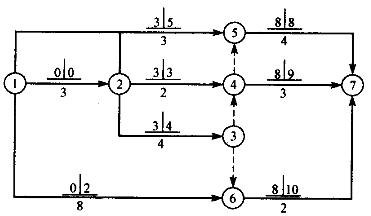 9.某设备安装工程的双代号网络计划如下图所示,图中已标出每项工作的最早开始时间和最迟开始时间,该计划表明( )。![]() |