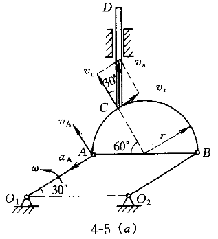 1.图4-5(a)所示机构由两曲柄O A和O B,半圆形平板ACB及铅直杆CD组成,它们都在图示平面内运动。已知曲柄O A以匀角速度ω= rad/s绕轴O 朝逆时针方向转动,O A=O B=15cm,O O =AB,半圆形平板的半径r= cm,O 和O 位于同一水平线上。则在图示位置时,CD杆的加速度a 为( )。![]() |