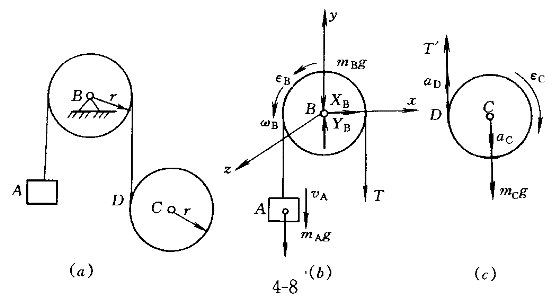 5.一绳索跨过均质定滑轮B,绳的一端挂一重物A;另一端缠绕一均质圆柱C,如图8(a)所示。已知重物A的质量为mA;定滑轮B和圆柱C的质量分别为mB和mc,它们的半径均为r。绳的质量略去不计,它对定滑轮无相对滑动。设m =m =2m ,则定滑轮与圆柱之间绳索的拉力T为( )。![]() |