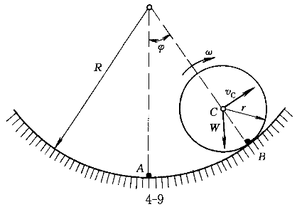 3.图9所示一重量为W、半径为r的均质圆柱,沿一半径为R的圆柱面上作纯滚动,圆柱体在圆柱面最低点A附近作微小振动时的固有圆频率p为( )。![]() |