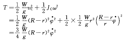 正确答案:B 解题思路:解:取ψ为广义坐标,以静平衡位置为势能的零位置。因重力为有势力,圆柱滚而不滑时约束力不作功,所以可用机械能守恒定理建立运动微分方程。由vc=(R-r) 和vc=rω可知ω=R-r /r其动能为 ![]() 势能为V=W[R-r-(R-r)cosψ] 由机械能守恒定理T+V=const,有 +W[R-r-(R-r)cosψ]=const将上式两边对t求导,再消去公因子 得 +W(R-r)Sinψ=0当ψ微小时,sin≈ψ,得 +2gψ/3(R-r)=0从而得知p= ![]() 故应选择B。 |
