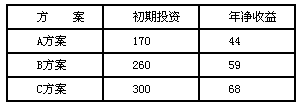 | 某建设项目有A、B、C三个方案,其寿命期均为10年,10年后的净残值为零,各个方案的初期投资和年净收益如表所示,基准收益率为10%。[已知(P/A,10%,10)=6.144] 单位:万元 ![]() |