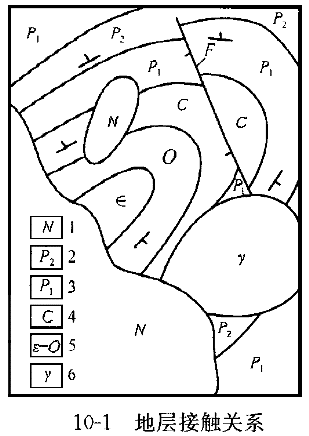 | 正确答案:B 解题思路:此题偏难,涉及地质识图、岩体接触关系和地质构造等知识,该题综合了历年有关接触关系、褶皱构造及地质年代等知识的题目类型,此处仅作为对地层的各种接触关系进行综合举例分析,基础考试仅会涉及其中部分知识点,弄清此图则可基本掌握与接触关系有关的任何类型题目。由图上的交切关系1切割所有地层,必为最晚,6被1切割又切割其他地层,故地层形成的先后次序为1;5(奥陶系)与4(石炭系)之间缺失了S(志留系)和D(泥盆系)的地层,而地层产状一致,故为假整合,此处应掌握地层年代表里地层年代的次序;图中可见断层切割4、3、2,又为1所切割,故断层在岩体1之前地层2之后形成,断层横切5、4、3、2所形成的褶皱的轴,故为横断层;由图中地层中间新两翼渐老,故为一背斜,由背斜形状及地层倾向知北斜轴向东北方向俯倾。故答案应为B。 |