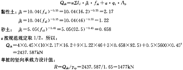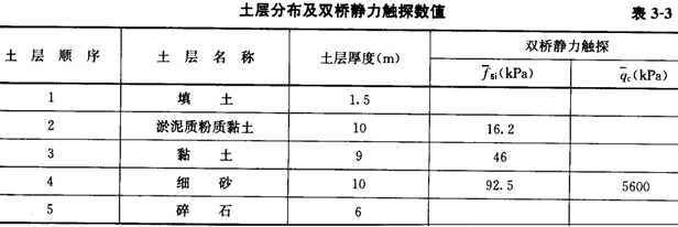 1.某一建筑场地土层的各项指标见表3-3,桩基承台底面埋深1.5m,以下为桩长22m、截面尺寸为450mm×450mm的钢筋混凝土预制桩,试按《建筑桩基技术规范》(JGJ94-94)推荐的经验公式计算单桩承载力。根据双桥探头静力触探试验结果计算单桩承载力,其值与下列( )项数据最为接近。![]() |