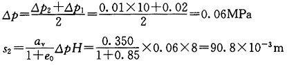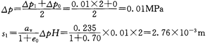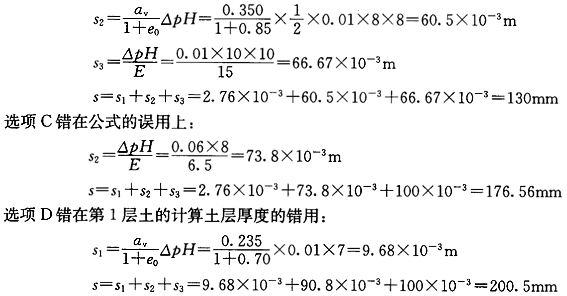 正确答案:B 解题思路:用分层总和法进行计算。黏土层和砂土层沉降量的计算公式分别为:![]() 式中 S黏、S砂-分别为黏土层和砂土层的最终沉降量(m); αv-土层的压缩或回弹系数(MPa );△P-由于地下水位变化而施加于土层上的平均压力(MPa); H-计算土层的厚度(m); e0-土层原始孔隙比; E-砂土层的弹性模量(MPa)。 地下水位每下降1m所对应的水压力为 ![]() (1)计算第1层粉质黏土的沉降量: ![]() (2)计算第2层黏土的沉降量: ![]() (3)计算第3层粉细砂的沉降量: ![]() (4)计算10年后的地面总沉降量: ![]() 故选B。选项A错在S2、S3的计算上: ![]() |