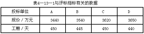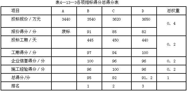 | 正确答案: 1.(1)本案例所列招标工作先后顺序不妥当。 (2)正确的顺序应为:①成立招标工作小组;②编制招标文件;③编制标底;④发布招标公告;⑤投标单位资格审查;⑥发放招标文件;⑦组织现场踏勘和招标答疑;⑧接收投标文件;⑨开标;⑩评标; 确定中标单位; 发出中标通知书; 签订承发包合同。2.A、B、C、D四家投标单位的报价得分计算如下: (1)A单位报价降低率:(3440-3600)/3600=-4.44%。 由于A单位报价降低率超过-4%,所以A为废标。 (2)B单位报价降低率:(3540-3600)/3600=-1.67%<4%; B单位报价上升率为:(3540-3600×96%)/(3600×96%)×100%=2.43%; B单位报价得分=100-3×3=91(分)。 (3)C单位报价降低率(3620-3600)/3600=0.56%<4%; C单位报价上升率为(3620-3600×96%)/(3600×96%)×100%=4.75%; C单位报价得分=100-3×5=85(分)。 (4)D单位报价降低率(3650-3600)/3600=1.39%<4%; D单位报价上升率为(3650-3600×96%)/(3600×96%)×100%=5.61%; D单位报价得分=100-3×6=82(分)。 各项指标得分及总得分表如表4-13-3所示。 ![]() 根据总得分最高者中标的原则,应确定中标单位为B单位。 |