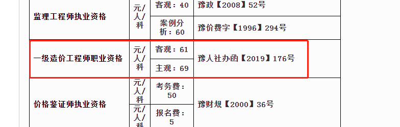 河南人事考试中心公布一级造价师收费标准目录,预人社办函【2019】176号,客观题:61元/人/科;主观题:69元/人/科