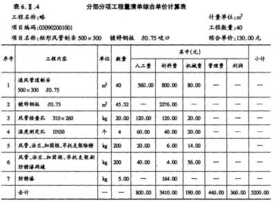 2.假设矩形风管500×300的工程量为40m2时,依据《建设工程工程量清单计范》的规定,计算矩形风管500× 300的工程量清单综合单价,将相关数据内容填入答表6.Ⅱ。4中,并在答题纸表6.Ⅱ.4下面列式计算所列项目的工程量或耗用量。