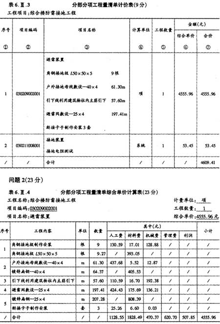 2.依据上述相关费用数据计算避雷装置项目的工程量清单综合单价,并分别填入答题纸表6.111.4“分部分项工程量清单综合单价计算 表”和答题纸表6.11.3“分部分项工程量清单计价表”中的第6、7项。(计算结果均保留两位小数)。