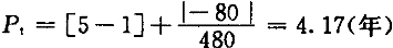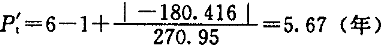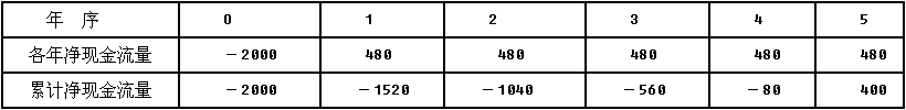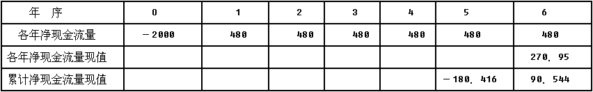 | 正确答案:B 解题思路:该题考核的是静态投资回收期和动态投资回收期的求法,应注意到每年的考题都涉及考核静态投资回收期,或者与动态投资回收期一起考核,或者与净现值一起考核。该题的具体求解方法为: (1)静态投资回收期( )![]() ![]() (2)动态投资回收期( ) 根据题中给出的条件:在第5年末的累计净现金流量现值为:NPV=-2000+480×(P/A,10%,5)=-180.416(万元)根据题中给出的条件:在第6年末的累计净现金流量现值为: NPV=-2000+480×(P/A,10%,6)=90.544(万元) ![]() |