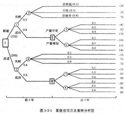 | 1.某建设项目可行性研究阶段拟定了两个生产线方案,项目实施期为10年。 方案1:对原有生产线进行改造,投资200万元,改造成功的概率为0.6。改造后前三年为投产试营期,综合风险变化因素与生产效率预计每年净现金流量为50万元。 方案2:安装新生产线,投资320万元,项目成功概率为0.8。安装后前3年为投产试营期,预计每年净现金流量为60万元。 若方案1、方案2均不成功,拟采用原生产线生产,并保持原生产线 水平(相关数据见表1-2-1)。两方案设计效果有可能使产量增加或不变。根据市场调研,今后10年内产品的价格下跌的概率为0.1,保持不变的可能性为0.5,价格上升的概率为0.4。 问题:假设今后10年内行业基准收益率为12%,以10年为项目计算期,试用决策树分析法对上述方案进行评价。 |