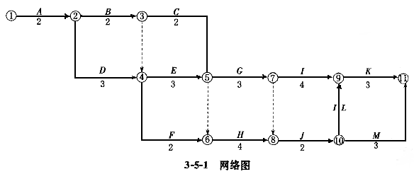 | 正确答案: 问题1: 事件1中,可以提出工期和费用的要求,因为承包商依据工程师提供的数据施工而导致供电出现故障。 事件2中,不可以提出工期和费用的要求,因为施工中因为具体机械使用改变而产生的费用应由承包商自行承担。 事件3中,可以提出工期和费用的补偿要求,因为设计变更是甲方的责任。 事件4中,不可以提出工期和费用的要求,因为冬季施工是一名成熟的承包商所能预见的问题,应当在投标报价时即做充分的考虑。 问题2: (1)确定原施工组织计划网络图的关键线路: 关键线路: A→D→E→G→I→K: ①→②→④→⑤→⑥→⑧→⑩→⑨→⑩ 事件1:B、C不在关键线路上,拖延时间没有超过总时差,故不能影响工期。 事件2:K在关键线路上,节省一天,故工期不需要补偿。 事件3:工期补偿为0天。 事件4:I、J在关键线路上,但由承包商自身原因造成的工期延长,不予以补偿。 综上所述,总工期不予以补偿。 问题3: 根据各项目调整后的工期,网络图调整如图3-5-2: ![]() 实际工期20d,拖后2d,罚款8000元。 问题4: 事件1:人工费补偿:(18+11)×12=348(元) 机械费补偿:1×615+2×310=1235(元) 事件2:不予以补偿。 事件3:H工作:20×95=1900(元) G工作:(200-20)×88-200×78=240(元) 事件4:I、J,在关键线路上,但由承包商原因造成的工期延长不予以补偿。 工程款变更合计: 348+1235+1900+240-8000=-4277(元) |