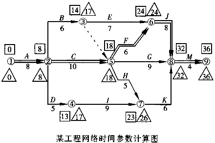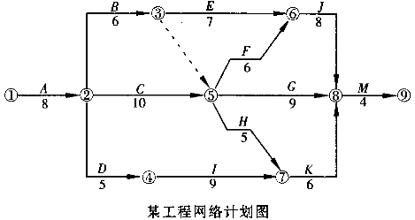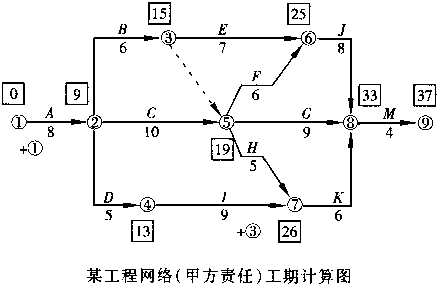 1.某建筑公司与某单位于2003年7月8日签订了教学楼承建合同,合同约定由于甲方责任造成总工期延误1天,甲方应向乙方补偿1万元,若乙方延误总工期1天,应扣除乙方工程款1万元;施工中实际工程量超过计划工程量10%以上时,超过部分按原单价的90%计算。双方对施工进度网络计划达成一致(见下图)。![]() 施工过程中发生以下事件: 事件1:A工程(基础土方)原计划土方量为400m ,因设计变更实际土方量为450m (原定单价为80元/m )。事件2:B工程施工中乙方为保证施工质量,将施工范围边缘扩大,原计划土方量由300m 增加到350m 。事件3:C工程施工结束后,监理工程师认为基柱内管线放线位置与设计图样不符,经剥露检查确实有误,延误工期2天,发生费用2万元。 事件4:I工程施工中发现甲方提供的设计图样有严重错误,修改图样致使乙方施工拖延3天,发生费用3万元。 事件5:G工程施工中乙方租赁的设备未按时到达现场,影响乙方施工拖延2天,发生费用1万元。 问题 1.该工程的计划工期为多少天?关键线路包括哪些单项工程? 2.上述事件中哪些应进行工期补偿,哪些应进行费用补偿? 3.该工程实际工期为多少天?应扣除或补偿乙方工程款多少万元? 4.如果C、I工程共用一台起重机,网络图中应如何表示?起重机正常在场时间为多少天?由于甲方责任在场时间增加多少天?如何处理?如补偿费用,是否补偿机上工作人员费用? |