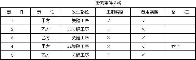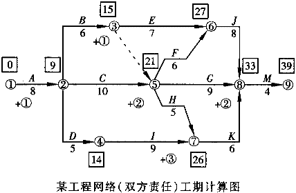 | 正确答案: 1.用标号法确定计划工期和关键线路。 原计划网络中计划工期为36天,关键工序为:A-C-F-J-M。 □中数据为事项最早时间或ES。△中数据为事项最迟时间或LF(见下图)。 ![]() 2.索赔事件分析表见下表所示: ![]() 事件1:发生在关键工序中,属甲方责任,按计划工期8天平均每天完成50m ,现实际工程量增加50m ,默示工期增加1天,应予顺延。应增加工程费为(80×40+80×0.9×10)元=3920元。事件4:发生在非关键工序,甲方延误责任,虽延误3天(本工序TF=1,其紧后工序为K,TF=3)对总工期无影响,故工期不予补偿,费用补偿3万元。 事件2、3、5均为乙方责任,故不予工期补偿和费用补偿。 3.实际工期计算如下图所示。 ![]() ![]() 包含甲方责任延误工期时间的工期为37天。 包含甲、乙双方延误时间的实际工期为39天,排除甲方责任工期37天剩余2天,即为由于甲方责任延误工期。故甲方应扣除乙方工程款2万元。 4.C、I共用1台起重机的施工计划可用下图表示。 ![]() C工序最早开工时间ES=8,I工序最早开工时间ES=18,最早完工时间EF=27,故正常情况下起重机在场时间为(27-8)天=19天。 在甲方延误责任的前提下,C工序ES=9,EF=19,I工序ES=19,EF=31;故起重机在场时间为(31-9)天=22天,比正常情况下增加了3天。 若起重机为乙方自有,应分别按原定台班费定额(工程量增加)或设备折旧费(窝工)给予补偿。 若起重机为乙方租赁,应分别按原定台班费定额或租金给予补偿。 费用补偿时不应支付机上工作人员工资费用,因此项费用已包含在机械台班费定额中。 |