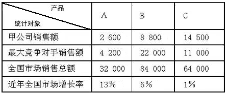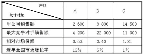 | 1.甲公司有三个事业部,分别从事A、B、C三类家电产品的生产和销售。这些产品的有关市场数据如表1和图1.在A、B、C三类产品市场上,甲公司的最大竞争对手分别是乙公司、丙公司和丁公司。 表12004年市场销售数据单位:万元 ![]() ![]() 问题: 1.A、B、C三类产品目前分别处在产品生命周期的哪个阶段,该产品所处阶段在市场容量、生产规模和消费者认知方面各自具有什么特点? 2.用波士顿矩阵分析甲公司的A、B、C三类产品分别属于何种业务? 3.甲公司对A、C两类产品应分别采取什么策略?为什么? 4.在波士顿矩阵中标示出甲公司A、C两类产品的发展策略路线方向。 |